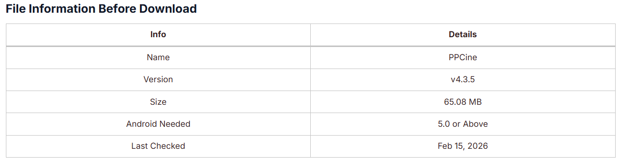 Below is the current version of the PPCine APK along with basic file details. I tested this file on multiple Android phones to check installation, permissions, and general stability. The install completed without errors, and the app opened normally after setup.